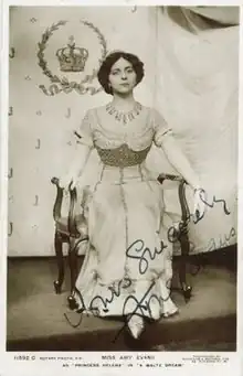Amy Evans (24 October 1884 – 5 January 1983) was a Welsh soprano and actress known for her performances in oratorio, recitals, and opera. She also made some music recordings beginning in 1906. In 1910, she played the leading role of Selene in W. S. Gilbert's last opera, Fallen Fairies, and sang at the Royal Opera House the same year and thereafter. She played Princess Helena in A Waltz Dream at Daly's Theatre in 1911.