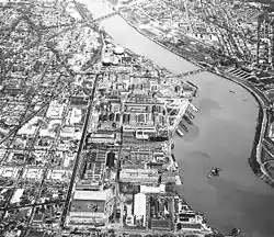 The Washington Navy Yard and its vicinity circa 1960. The Anacostia River runs diagonally from upper left to lower right center, crossed by the Eleventh Street Bridge (in center) and the Sousa Bridge (Pennsylvania Avenue) near the top