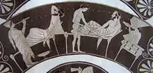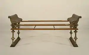 Ancient Greek furniture was typically constructed out of wood, though it might also be made of stone or metal, such as bronze, iron, gold, and silver. Little wood survives from ancient Greece, though varieties mentioned in texts concerning Greece and Rome include maple, oak, beech, yew, and willow.[56] Pieces were assembled using mortise-and-tenon joinery, held together with lashings, pegs, metal nails, and glue. Wood was shaped by carving, steam treatment, the lathe, and furniture is known to have been decorated with ivory, tortoise shell, glass, gold, or other precious materials.[57] Similarly, furniture could be veneered with expensive types of wood to make the object appear more costly,[58] though classical furniture was often pared down in comparison to objects attested in the East, or those from earlier periods in Greece.[35]
