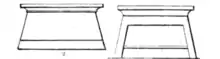 Stools did not come into being in Egypt until the 18th Dynasty. Still, the majority of people did not have chairs, so stools were most people's only option for comfortable seating.[42] This resulting in stools becoming one of the most common kinds of furniture. They were usually made with four legs, a slightly curved seat, and latticework bracing. The most simple ones were made of three legs with a solid, flat, wooden slab seat. Another type of folding stool had crossed legs and a leather fabric seat. This stool used goose and duck heads to form the lower end of the seat. It is likely this kind of stool was used for personal travel. Three small 18th Dynasty stools have plaited rush seats and short sturdy legs. Such stools, despite being six inches high and a foot square, were employed as seats rather than footstools. Other 18th Dynasty chairs had four slender cylindrical legs with waisted lower parts decorated with bands of incised rings. Light horizontal stretchers found within the legs indicate that all parts of the stool were the same in the three primary dimensions. This chair was made of a dark heavy hardwood, likely tamarisk, and a light softwood, possibly pine. The rushwork seats were made of string mesh and leather. Ceremonial stools would be blocks of stone or wood. If the stool was made out of wood it would have a flint seat.[5] Footstools were made of wood. The Royal Footstool had enemies of Egypt painted on the footstool, so that way the pharaoh could symbolically crush them.[5][34] Stools used by the upper-classwould have upward sweeping corners and woven leather seats, with a padded cushion on top.[43]