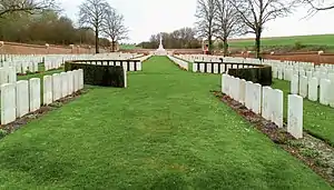 The Ancre British Cemetery is a cemetery located in the Somme region of France commemorating British and Commonwealth soldiers who fought in the Battle of the Somme in World War I. The cemetery contains mainly those who died on 1 July 1916 during the first Allied attack on the village of Beaumont-Hamel, on 3 September 1916 during the second Allied attack on the village, and on 13 November 1916 during the capture of the village and the nearby towns of Beaucourt-sur-Ancre and St. Pierre-Divion.[1][2]