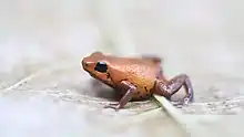 This small frog is 11 to 13 mm long and is a chrome orange in colour.[1] The feet do not have any webbing and females are slightly larger than the males.