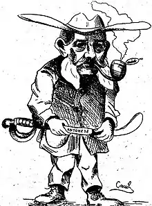 Caricature of Andrés Baquero. In his hands he holds a sabre with the name "Antonete", due to a controversy of the time about the authenticity of the weapon that was then exposed in the Provincial Museum as belonging to the revolutionary Antonio Gálvez Arce.