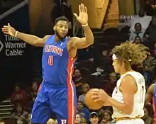 Drummond recorded double-doubles in each of the Pistons' first three games of the 2015–16 season, helping lead the team to an NBA-tying-best 3–0 record for the first time since the 2008–09 season. He became the first Pistons player to record three consecutive double-doubles to start the season since Ben Wallace in 2004–05.[29] He was subsequently named the Eastern Conference Player of the Week for the first week of the season, becoming the first Piston to win the award since Rodney Stuckey did so in December 2009.[30] On November 3, Drummond recorded 25 points and a career-high 29 rebounds in a loss to the Indiana Pacers, becoming the first Piston with back-to-back 20/20 games since 1985.[31][32] On November 8, he recorded 29 points and 27 rebounds in a win over the Portland Trail Blazers, joining Kareem Abdul-Jabbar and Wilt Chamberlain as the only players with three 20/20 games in the first six games of a season.[33] He was subsequently named the Eastern Conference Player of the Week for the second week of the season, becoming the first Piston to win player of the week in consecutive weeks, and the first player to win the award in the first two weeks of the season since LeBron James in 2011–12.[34] On November 21, Drummond's streak of 11 consecutive double-doubles to begin the season came to an end. This was the longest streak by a Piston since Dave DeBusschere recorded 13 consecutive double-doubles in 1966–67.[35] On December 18, Drummond recorded 21 rebounds and a career-high 33 points in a 147–144 quadruple-overtime win over the Chicago Bulls. He became the first Pistons player with at least 30 points and 20 rebounds in a game since Dennis Rodman in 1990–91.[36][37][38]