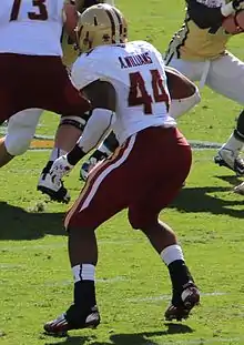 Williams's first three years at Boston College were relatively uneventful. Playing as a true freshman in 2010, Williams showed his potential while sharing the backfield with Montel Harris and Sterlin Phifer.[8] He played in all 13 games, rushing for 461 yards on 95 carries with two touchdowns.[9] In the final regular season game of the year, playing at Syracuse, he set the school record for rushing attempts in a game, running 42 times as the Eagles beat the Orange 16–7.[10]