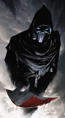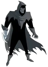 Described by Timm as resembling a "tall, gaunt Death character",[6] the Phantasm's costume is hooded and features a metal, skull-like mask. The Phantasm carries a large blade, reminiscent of a scythe, in her right hand. The blade was not part of Timm's original design, and was added later at Burnett's insistence.[1] The character's left glove houses a chemically-based, artificial fog-generating device that the Phantasm uses for stealth, combat, and intimidation. At various points in Mask of the Phantasm, the Phantasm's manipulation of fog makes it appear that the character has supernatural powers, such as intangibility and the ability to vanish. These smoke-filled appearances were influenced by the Marvel Comics supervillain Mysterio.[8]