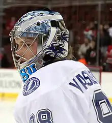 On 14 November 2018, Vasilevskiy suffered an injury while in practice. Two days later, it was announced that he would be sidelined for four to six weeks with a broken left foot.[34] Vasilevskiy returned 4 weeks later and started his first game back on 13 December, in a home game against the Toronto Maple Leafs. In that game he tied the Lightning team record for most saves in a game with 48 saves, tying a record Ben Bishop set in 2014 and helping the Lightning win 4–1.[35] On 8 January 2019, Vasilevskiy was added to the Atlantic Division roster for the 2019 National Hockey League All-Star Game as a replacement for an injured Carey Price.[36] On 15 January 2019, Vasilevskiy recorded a shutout in a 2–0 Lightning win over the Dallas Stars at American Airlines Center.[37] The shutout moved Vasilevskiy past Nikolai Khabibulin (14) for second most shutouts in franchise history (15).[38] On 14 February 2019, Vasilevskiy recorded a shutout in a 6–0 Lightning victory over the Dallas Stars to move him into a tie with Ben Bishop (17) for most shutouts in Lightning history.[39] On 16 February 2019, Vasilevskiy recorded a shutout in consecutive games to give him the franchise record for shutouts (18).[40] On 20 March 2019, Vasilevskiy recorded 54 saves in a 5–4 overtime win over the Washington Capitals at Capital One Arena to set the Lightning record for the most saves in a game.[41] In a 13-save victory over the Boston Bruins on 25 March 2019, Vasilevskiy moved past Ben Bishop for the most saves in franchise history (5739).[42] On 1 April 2019, Vasilevskiy started in his 207th career NHL game to pass Daren Puppa (206) for second most starts in franchise history.[43] On 19 June 2019, at the 2019 NHL Awards, Vasilevskiy was awarded the Vezina Trophy as the top goaltender in the league. He was the first player in franchise history to win the award.[44]