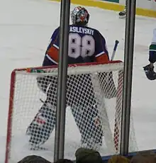 On 16 December 2014, Vasilevskiy was recalled to the Tampa Bay Lightning.[6] He then started that night in his NHL debut, a 3–1 victory over the Philadelphia Flyers.[7] He also accomplished another feat that night by becoming the first NHL goaltender to ever wear the number 88. He recorded his first NHL shutout on 3 March 2015, over the Buffalo Sabres in a 28-save performance.[8] Vasilevskiy's first playoff win came on 6 June 2015, when he replaced starting goaltender Ben Bishop twice during the third period of Game 2 of the Finals; he thus became the first goalie in 24 years to win a playoff Final in relief and the first to earn his first career playoff win in relief in the Final since Lester Patrick in 1928.[9] The Lightning would go on to lose the finals against the Chicago Blackhawks in 6 games.