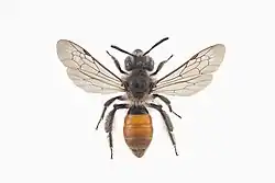 The females of A. marginata occur in different colour forms. Usually the females have strongly hairs and a special pollen basket on hind legs. Moreover, in the females the hind body lacks hairs and they are black only on the first tergite (hind body segment), while other tergites are orange colored. Some females are predominantly orange. However more or less completely black or dark individuals can be found in both sexes.[4][6][7]