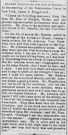 Journalist Noah Brooks, present in the press gallery that day, wrote in 1895 that Johnson's face was "extraordinarily red" and that he was "evidently intoxicated."[40] The Washington correspondent of the Cincinnati Commercial wrote, "Drunkenness may be entered as a plea in abatement for him, for he had been crazed with liquor for several preceding days. As he entered the Chamber, his frame shook with the tremor of debauch."[41] According to the Times of London reporter, "He had not uttered two sentences when everyone saw something was wrong."[42]
