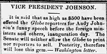 Yesterday the Vice President elect, Hon. Andrew Johnson, arrived in our city, en route for the scene of his future glories at Washington. In the evening, after a collection had been made by several prominent Republicans in the city, a brass band was hired to serenade the dignitary at the Burnet House. The Hon. Johnson came forward to respond, but appeared to be suffering from severe physical weakness, and could not be long exposed to the keen night air. Our shorthand reporter's notes of the speech, when written out, present an unintelligible appearance, exhibiting three or four "fellow citizens" on each line [...] We must apologize [...] and promise Mr. Johnson a better report next time.[20]