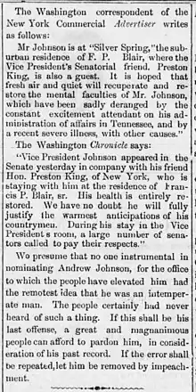 After the fact, Johnson "hid from the press" at the Silver Spring estate of the Blair family in Maryland.[60] According to historian Louis Clinton Hatch, "The Senate Journal shows that he presided at the session of Monday, March 6, and the correspondent of the New York Tribune wrote his paper that the Vice-President attended the inauguration ball that evening and was especially attentive to Mrs. Lincoln; but, on March 7, Mr. Johnson was absent from the Senate and remained so throughout the session. It is probable that he went to Silver Spring on that day, and it is certain that he stayed there about a fortnight until after the Senate had adjourned, after the excitement over his inauguration had died down, and his health had improved."[91][lower-alpha 7][lower-alpha 8] From Maryland, Johnson wrote letters explaining that had been "prostrated" by typhoid.[60] Johnson made no public appearances until April 3, when he made an impromptu speech in front of a Pennsylvania Avenue hotel about the fall of the Confederate capital.[60] According to the memoirs of James G. Blaine, Johnson was back in Washington again about April 9, 1865, and "when Mr. Johnson arrived from Fortress Monroe on the morning of April 10, and found the National Capital in a blaze of patriotic excitement over the surrender of Lee's army the day before at Appomattox, he hastened to the White House, and addressed to the unwilling ears of Mr. Lincoln an earnest protest against the indulgent terms conceded by General Grant."[93] In 1866, a Tennessee newspaper account had it that Lincoln met with Johnson on April 11, 1865, forgoing a family carriage ride to take the meeting, and when he returned, "remarked with much apparent concern 'That miserable man; I cannot imagine the trouble he will cause during my second term of office.'"[94] According to the standard account, Johnson and Lincoln supposedly did not meet again until the afternoon of April 14. That night John Wilkes Booth shot Lincoln in back of the head; the 16th president died at 7:22 a.m. the following day. Johnson's 42-day term would be the second-shortest vice-presidency in American history.