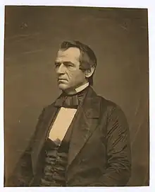 Johnson had a reputation as a politically astute character of no particular dogma with a chip on his shoulder about growing up poor and a marked tendency to demagogic speeches.[6][7] In additional to perhaps having some common experiences as frontier boys with roots in the Old Southwest, the Lincoln and Johnson families had some remote kinship ties and friends in common (for example, Johnson's 1827 wedding had been officiated by Lincoln's uncle Mordecai Lincoln).[8][lower-alpha 1]