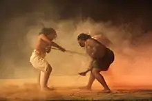 Angampora is a Sinhalese martial art that combines combat techniques, self-defense, sport, exercise, and meditation.[1][2] A key component of angampora is the namesake angam, which incorporates hand-to-hand fighting, and illangam, involving the use of indigenous weapons such as the ethunu kaduwa, staves, knives and swords.[3][4] Another component known as maya angam, which uses spells and incantations for combat, is also said to have existed.[5] Angampora's distinct feature lies in the use of pressure point attacks to inflict pain or permanently paralyze the opponent. Fighters usually make use of both striking and grappling techniques, and fight until the opponent is caught in a submission lock that they cannot escape. Usage of weapons is discretionary. Perimeters of fighting are defined in advance, and in some of the cases is a pit.[5][6]
