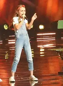 In the next round Fiori's Angelina, Eléa and Lara battled it out singing LP's "Lost on You", and it was Angelina who was chosen by the coach for the semifinal.[12] In the semifinal, she sang Zazie's "J'envoie valser" ("I Send a Waltz"), becoming one of the two team members her coach chose for the final.[13] (Another coach, M. Pokora, also suggested these two for the final, while Jenifer preferred Dylan and Cassidy.)[14] In the live final, Angelina first sang Stromae's "Tous les mêmes" ("[They Are] All the Same") and then repeated her audition song, "All in You", and won.[15]