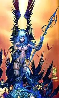 The Angelus is an American comic character featured in publications by Top Cow Productions. Initially appearing in the first lineup of The Darkness in 1997, the Angelus has featured as an antagonist and occasional supporting character in issues of The Darkness and The Witchblade.[1][2] Described as the equal and opposite of the Darkness, as well as essentially being the mother of the Witchblade, the Angelus is a powerful opponent that has challenged both Jackie Estacado and Sara Pezzini on several occasions. She has also made cameos in a few other Top Cow titles.