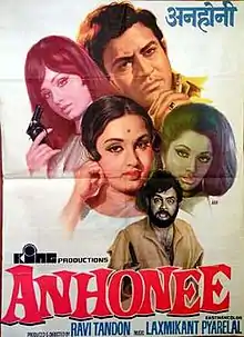 Anhonee is a 1973 Bollywood suspense drama film directed by Ravi Tandon. It stars Sanjeev Kumar, Leena Chandavarkar, Bindu, Padma Khanna and Kamini Kaushal. Laxmikant-Pyarelal provided the music for the film. Year 1996 movie Chhote Sarkar was partially inspired by this film. This is considered one of the best crime thriller film made in Bollywood.