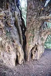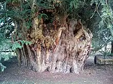 The Ankerwycke Yew is an ancient yew tree close to the ruins of St Mary's Priory, the site of a Benedictine nunnery built in the 12th century, near Wraysbury in Berkshire, England. It is a male tree with a girth of 8 metres (26 ft) at 0.3 metres.[1] The tree is at least 1,400 years old,[2] and could be as old as 2,500 years.[3]