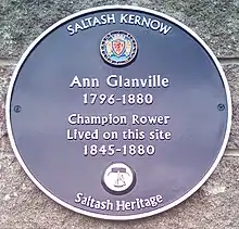 Ann formed a crew of four female rowers who took part in local regattas; she was noted for her large stature and for her crew who dressed in white caps and dresses. Their success led to competitions all over the country; one event at Fleetwood was watched by Queen Victoria, who congratulated Ann when they won by beating an all-male crew. The most famous competition was said to have been in 1833 when they visited Le Havre and beat the best ten French male crews by 100 yards; this led the press to call her the champion female rower of the world.[1][2][3] However, recent research by A T Goodman for the Old Cornwall Society has thrown doubt on this version of events. The visit to Le Havre was actually in August 1842 aboard the paddle steamer Grand Turk; the French refused to put up a team to row against women and so a demonstration race was conducted between Ann Glanville's female crew and male rowers from the Grand Turk, which was won by the women.[2]