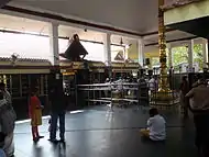 The temple is built on a 40-cent land near the Visveswarayya Tower.[2] The temple has shrines for Ganesha, Muruga, Durga, Anjaneya, Navagrahas and Nagaraja.[1] The main sanctum of Lord Ayyappa faces west with Lord Ganesha and Lord Subramanya to the left and Goddess Durga to the right, all facing east. The Navagraha shrine is located on the southeast corner of the temple and the Anjaneya shrine is located in the southwest corner, facing east.[2] The main door at the entrance is covered with brass plates. There is an auditorium, named after Sri Adisankara, covering about 3,600 sq ft,[2] which can accommodate about 1,000 persons,[1] for conducting spiritual and cultural programmes and discourses. The design of the auditorium involves the Koothambalam style found in Kerala temples.[2]