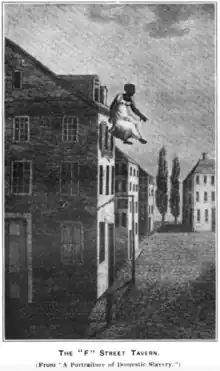 In November 1815, Williams was sold to Georgia slave traders and forcibly separated from her family. During this period, she jumped from the third-floor window of the F Street Tavern in Washington, D.C.[6] The action became highly publicized, with Abolitionist writers sharing the story as an example of the human indignities of the slave trade. Williams fractured her arms and broke her back due to the fall, but she survived. After her fall, the slave trader left Williams behind but still took her two daughters away to be sold.[3]