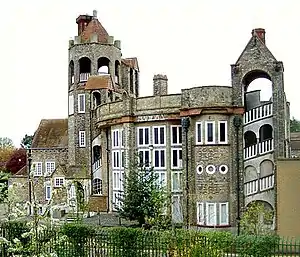 The Cloisters was built by Quaker Miss Annie Jane Lawrence (16 April 1863 – 3 August 1953), the daughter of Alfred Lawrence (1826–1875), who, with his brother Frederick, owned 'Lawrence Brothers, Smiths and Founders', and his wife Mary Elizabeth (née Ridge, 1838–1903).[1] Her grandfather William Lawrence (1789–1855) came from humble origins but went on to be elected Master of the Worshipful Company of Carpenters in 1848 and an Alderman of the City of London, while her uncle Sir James Lawrence was Lord Mayor of London in 1868. Her younger brother was the Labour politician Frederick Pethick-Lawrence, 1st Baron Pethick-Lawrence (1871–1961).[2] In 1881 she was a pupil at the School for Ladies in Hove in Sussex, while in 1895 she visited Boston in the USA.[3]