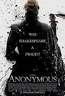 The film premiered at the Toronto International Film Festival on September 11, 2011.[5] Produced by Centropolis Entertainment and Studio Babelsberg and distributed by Columbia Pictures, Anonymous was released on October 28, 2011 in the United States, Canada and the United Kingdom, expanding to theatres around the world in the following weeks. The film was a box office flop and received mixed reviews, with critics praising its performances and visual achievements, but criticising the film's time-jumping format, factual errors, and promotion of the Oxfordian theory of Shakespeare authorship.[6]