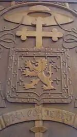 Mayer's coat of arms on a wooden door of the Church of "Our Lady of Aparecida and St. Fidelis"