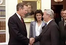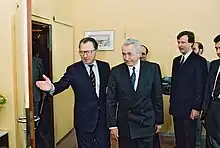 Approximately at noon of 7 October 1991, Marković met with Stjepan Mesić, then President of the Presidency of Yugoslavia and Franjo Tuđman, then President of Croatia in the Banski dvori.[13] The purpose of the meeting was to persuade Marković to leave his position as the head of the Yugoslav federal government and endorse Croatian independence. Nonetheless the persuasion left Marković unfazed and unplacated. The three then moved into the president's office for dessert. Shortly after, the Yugoslav People's Army attempted to assassinate Marković along with the democratically elected leadership of Croatia with a decapitation strike on Banski dvori. Marković immediately blamed Yugoslav defense minister Veljko Kadijević, and refused to return to Belgrade until Kadijević resigned from his post.[13]