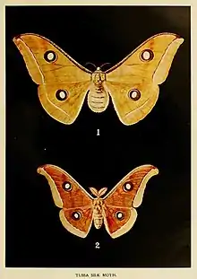 Antheraea paphia, known as the South India small tussore, the tasar silkworm and vanya silkworm[2] is a species of moth of the family Saturniidae found in India[3][4] and Sri Lanka.[5] The bulk of the literature on this species uses a junior synonym, Antheraea mylitta, rather than the correct name, A. paphia.[1] It is one of a number of tasar silkworms, species that produce Tussar silk, a kind of wild silk that is made from the products of saturniid silkworms instead of the domesticated silkworm (Bombyx mori).[6]