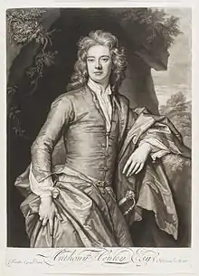 Henley was son of Sir Robert Henley of the Grange, near Alresford, Hampshire, Member of Parliament for Andover and his second wife Barbara Hungerford, daughter of Anthony Hungerford.[1] He matriculated at Christ Church, Oxford on 3 March 1682, aged 15 and was admitted at Middle Temple in 1684. At Oxford he studied classical literature, particularly poetry.[2] His grandfather was the legal official Sir Robert Henley, master of the court of king's bench, on the pleas side. Out of the profits of this post Anthony inherited a fortune of more than £3,000 a year.