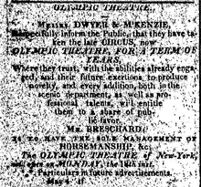 The theatre was converted from a circus building used by Pepin and Breschard and located at 79-85 Anthony Street (which is now Worth Street) in Manhattan. (The circus appears to have relocated to Broadway at the corner of White Street.[1] However, there is much confusion among old sources between these two locations.) The first serious competition to the Park Theatre, the venue opened on May 22, 1812, managed by John Dwyer and Donald McKenzie as the Olympic Theatre. The first performance was The Way to Get Married, followed by "grand feats of horsemanship by Mr. Breschard and Company", and a farce called The Spoild Child.[2][3][4]