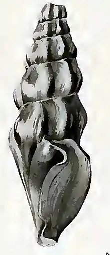 (Original description) The small, solid shell has a cylindro-fusiform shape. It is polished and constricted at the sutures. On decollate specimens six whorls remain, divided by linear sutures. The colour of the shell is amber-brown, with ochraceous reflections. The sculpture shows prominent, arcuate ribs, each slightly overhanging the one below, seven to a whorl, consecutive on the spire, smaller on the body whorl where they do not reach the base. On the base and snout are six revolving threads. The aperture is rather wide, flanked by a tall and thick varix. The edge of the outer lip is thin, insinuate at the base. The columella is perpendicular and concave. The siphonal canal is short and wide. The sinus is wide and shallow. A prominent callus knob is prominent at the lip insertion.[2]