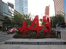 An antimonumento was installed in front of the Superior Court of Justice of Mexico City, on the median strip of Paseo de la Reforma Avenue, in the Cuauhtémoc borough of Mexico City. The work included the installation of a red number 43 made of metal along with a plus symbol, in reference to the forty-three students kidnapped—and possibly killed—in Iguala, Guerrero, in 2014 after being arrested for allegedly committing criminal offenses, plus the six students and witnesses killed during that event, and to honor the more than 150,000 people killed since the start of the Mexican drug war and the 30,000 disappeared persons reported by 2015.[1] The anti-monument was installed by peaceful protesters during a demonstration on 26 April 2015 as a plea for justice and to prevent the case from being forgotten by the authorities and society. The sculpture became the first of its kind in Mexico and would inspire the installation of other guerrilla-like memorials throughout the city and in other states of the country.