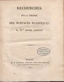 - ↑ This is equation (B) in Germain's own book. Sophie Germain (1821). Recherches sur la théorie des surfaces élastiques. p. 27.