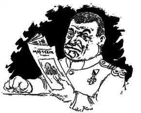 Moș Teacă, which endures as Bacalbașa's best liked series,[4] is a tragicomic account of military life. The eponymous hero is a grotesque Army Captain, who is comically illiterate but savage in his treatment of the recruits. The reader never learns his actual name, but only his nickname, literally "Old Man Scabbard", but also rendered as "Captain Scabbard"[87] (Bacalbașa hints that derogatory nicknames were commonly used by the recruits when referring to their unpopular superiors).[88] It is generally held that Toni's anti-hero is in large part inspired by a standard of French literature, in particular by Charles Leroy's Col. Ramollot and Henry Monnier's Joseph Prudhomme.[89] This interpretation is nuanced by researcher Constantin Ciopraga, who argues: "As a former army volunteer, the future journalist Bacalbașa did not need the French model proposed by Charles Leroy in Le Colonel Ramollot; he was directly familiarized with the Prussian spirit of yesteryear."[90]