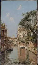 In 1882 he received a scholarship from the Provincial Council to further his art studies in Italy.[4] He moved to Rome (where he was to live until his death), and in 1885 visited Venice; from that year on, Venetian landscapes, showing landmarks like the Grand Canal and Piazza San Marco but also less known quarters of the city, are ubiquitous in his work.[4] Venice was at that time an artistic hub for Spanish painters, thanks in part to Fortuny's widow residing there, and also because of the Venetian production of Villegas Cordero and Martín Rico, whose preciosity in the depiction of the landscape was adopted by Reyna Manescau.[2]
