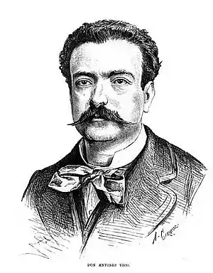An early mentor was the actor José Valero, from whom he learned some of the "heartthrob" roles, until 1864 which was when Antonio Vico switched to the Victorino Tamayo theatre company. It was another nine years before he attracted attention with his interpretation of "Los amantes de Teruel" at the Teatro Lope de Rueda (as it was then known) in Madrid.[2] Shortly after this he formed a theatre company with Rafael Calvo Revilla, with whom from now on he maintained an intermittent but fruitful working friendship.[3]