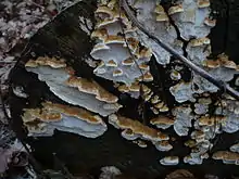 Antrodia serialis is a species of polypore fungus in the genus Antrodia. Originally named Polyporus serialis by Elias Fries in 1821,[1] it was given its current name by Marinus Anton Donk in 1966.[2] A widespread species, A. serialis causes heart rot in living trees.[3] In North America, it is often confused with the morphologically similar Antrodia serialiformis, which grows on oak.[4]
