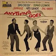 Anything Goes is a soundtrack album issued by Decca Records (DL 8318) from the film of the same name. (See Anything Goes for the film.) The film starred Bing Crosby, Donald O'Connor, Jeanmaire, and Mitzi Gaynor. Joseph J. Lilley was the musical director with special orchestral arrangements by Van Cleave. All the songs were written by Cole Porter with the exception of three additional songs from Jimmy Van Heusen (music) and Sammy Cahn (lyrics) which have been annotated in the listing below. The soundtrack recording took place between April and June 1955.[1] Three songs were recorded in February 1956 with Joseph J. Lilley and his Orchestra for inclusion in the album to replace the original soundtrack versions.[2]