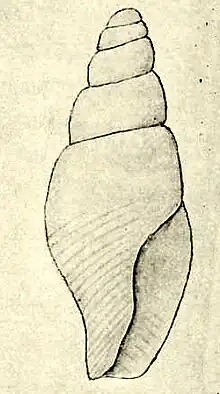 The spire is elevated-conic, with a blunt apex, a little higher than the aperture. The outlines are straight. The protoconch consists of 1½ smooth and polished whorls, the nucleus broadly rounded. The spire contains 5 whorls, regularly increasing and very flatly convex. The base of the shell is lightly contracted. The suture is moderately impressed. The aperture is slightly oblique, high and narrow, its sides subparallel, angled above, with a short broad and truncated siphonal canal below. The outer lip is thin and sharp, gently curved above, broadly rounded below. The columella is vertical, smooth, straight, but bent to the left below. The inner lip is very narrow, extending over the lightly excavated parietal wall. [2]