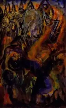 The Apocalypse Series encompasses 125 works consisting of 75 paintings and 50 drawings created between 1982 and 1984 by Nabil Kanso.[1] The subjects of the works in the series are based on the Revelation of Saint John the Evangelist.[2] The colors of this painting are somber, suggesting richness and heaviness, while the repetitive geometry of the shapes suggest apocalyptic inevitability. In Peran Erminy's article, The Apocalyptic Paintings of Nabil Kanso, he clearly states that Kanso's paintings portray our world today. He states that our world is constantly surrounded by violence and people feel vulnerable.[3] The aggression one has can ultimately lead to a break out in war where the world will be doomed. Kanso's paintings reflect the path we are taking as a world. People today are quick to act upon threats leading us into a world that is ruled by war. This will be the hell on earth made by none other than human beings themselves. Kanso has a strong, intense effect on his audience's feelings and emotions. Kanso's work is dark and sometimes frightening, conveying how it is relevant to the scary obstacles of today's world. Our society seems to be stuck on depressing violence and aggression and if continued on this path, will only continue to result in tragic wars.[4]