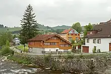 Under the authority of the abbots of the monastery of St. Gall settlers began to colonization of the Sitter river valley in the late 11th century. It is mentioned, in a deed granting rights to clear land, in 1071 as Abbacella.[3] At the same time, the parish of St. Mauritius was established. By 1200, the parish included the area of the modern district as well as villages of Brenden, Lank, Lehn and Meistersrüte. The meager records before 1500 does not allow accurate reconstruction of the early residential development. It is likely that the first village houses were along the road between church and abbot's farm, which was built at what is now Reichsstrasse near the Gansbach stream. This gave the early village an east–west orientation. East of the church the Metzibrücke bridge was built over the Sitter. This led to the extension of the village across the river. The eastern end of the village was a conglomerate of economic and administrative buildings.[4]