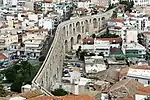 While the aqueduct is of Roman origin, the present structure was built by the Ottomans in the 16th century.[1] A Byzantine barrier wall of the early 14th century, built as part of the fortifications on the Acropolis of Kavala, probably also functioned as an aqueduct. If so, it would have been a rare example of a Byzantine aqueduct, since Byzantine cities more typically used wells and cisterns rather than either maintaining existing Roman aqueducts or building new ones.[2] The barrier wall was replaced with the present arched aqueduct during Suleiman the Magnificent's repair and improvement of the Byzantine fortifications. Some authors date that construction to the time of the 1522 Siege of Rhodes, but a more likely date is between 1530 and 1536.[3] As late as 1911, it supplied the city with drinking water from Mount Pangaeus.[4]