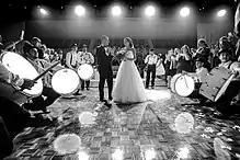 The bride and groom then switch rings from their right hand to their left index finger. With this ritual, the festivities begin. The bride and groom have the first dance, after which the other wedding guests join in. Usually a belly dancer or a singer entertains the guests, but more luxurious weddings will have more than one entertainer. Guests will dance and sing with the newlywed couple, and the groom will sometimes be tossed in the air by friends. In modern weddings, after the formal entertainment, a disc jockey will extend the festivities.