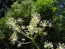 It is a deciduous, herbaceous, perennial plant growing to a height of 2–3 m on stems which are thick but not woody. The stems bear large green pinnately compound or tri-pinnately compound leaves 1–2 m long and 1 m broad, the leaflets 15–30 cm long and 7–15 cm broad. The leaflets are arranged opposite with an odd terminal leaflet. The greenish white flowers are produced in large compound racemes of umbels 30–45 cm in diameter at the stem apex; each flower is 2–3 mm in diameter, and matures to small (3–5 mm) dark purple or black fruit, each berry containing 35 seeds.[2]