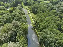 There are three ponds in the eastern portion. To the north, is located Arcadia pond, a man-made clay pit pond.[5][6] From it flows Piaseczno Ditch, which discharges into the ponds in the Royal Baths Park, and into basin of the Czerniaków Port, in the Vistula River.[7]