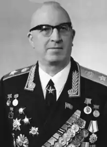 Archil Viktorovich Gelovani (Georgian: არჩილ გელოვანი, Russian: Арчил Викторович Геловани; 27 November [O.S. 14 November] 1915 – 19 August 1978) was a Soviet officer and later Marshal of the engineer troops, responsible for logistics, fortification and military infrastructure during and after World War II. He was tasked on several occasions with fortifying strategically important areas and also reconstruction, including all Black Sea ports during and after World War II. He served primarily on military engineering and defense strategy posts, including being the Deputy Minister of Defence and would play a major role in the structural development of the Soviet armed forces and strategic missile forces during the Cold War era. An avenue in Georgia's capital Tbilisi and a street in the city of Sevastopol have been named after Marshal Gelovani.[1]