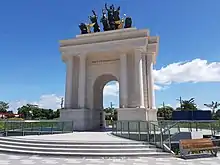 The Arco de Emperador is a 23-metre (75 ft) high Neoclassical monument arch that serves as the iconic landmark of the Arcovia City township. It is the Philippines' tallest monument and one of the first triumphal arches in the country that was completed in February 2019.[12] The archway was designed by Spanish sculptor Ginés Serrán-Pagán in 2013 who started work on the bronze sculptures in 2015.[10] It was patterned after the Arco de la Victoria in Madrid, Spain.[2]