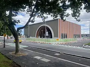 The central gateway feature of the design is set of 15 large brick archways above the station entrance.[18] The concrete arches are lined with 104,000 locally manufactured bricks, and were made offsite then craned onto site in 2022.[17] The station entrance area is raised 150 centimetres (4 ft 11 in) to prevent flooding of the tunnel from the nearby Moonee Ponds creek.[17] The station was designed by RSHP, Hassell and Weston Williamson.[18]